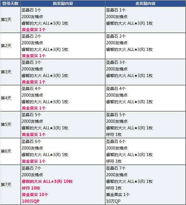 登录奖励共计可获得:圣晶石28个、呼符10枚、友情点14000点 、睿智的大火16枚、黄金果实16个、100万QP!