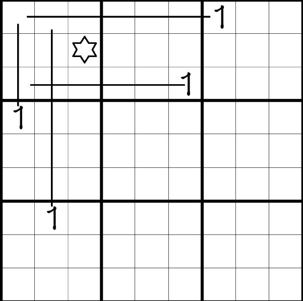 那么,结合已知数的数字1对于第一宫进行排除,我们可以得到第一宫的数字1一定在星格里。