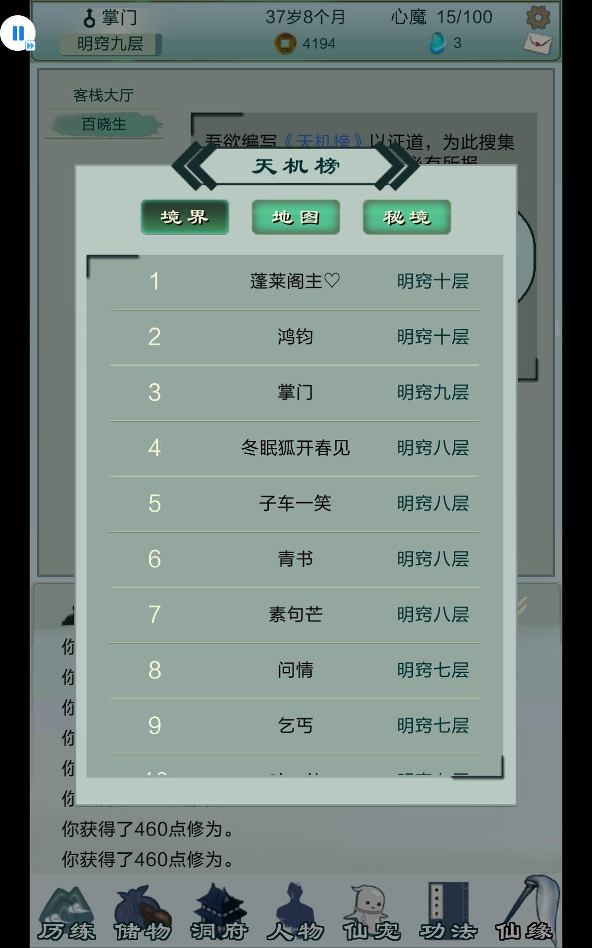 这游戏玩了也快一个月了,从第一次要这种游戏,到慢慢的走在前列,确实是一路坎坷,玩游戏嘛开心就好,所以刚玩的时候我就给自己定一个小目标:进去天机榜随便哪个位置。我在群里说出这个目标的时候,很多人都说不可能的,想太多了,毕竟我玩的比别人晚………算了过两天就删测结束了,特给自己留下一份帖子,证明我掌门来过,后面的道友们加油!!!!