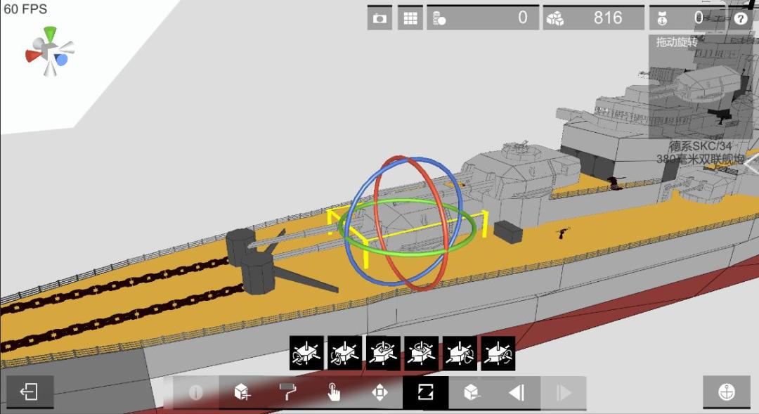 通过这些按钮,就可以实现对设计界面零件的微调。其中旋转按钮对应90度,移动按钮对应0.5单位。分别都是工艺战舰中的移动和旋转的最小单位,方便提督们可以更好地设计船只。