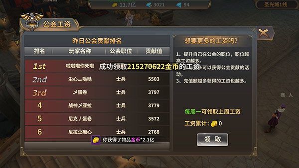 2、每周公会贡献越多,工资越高。