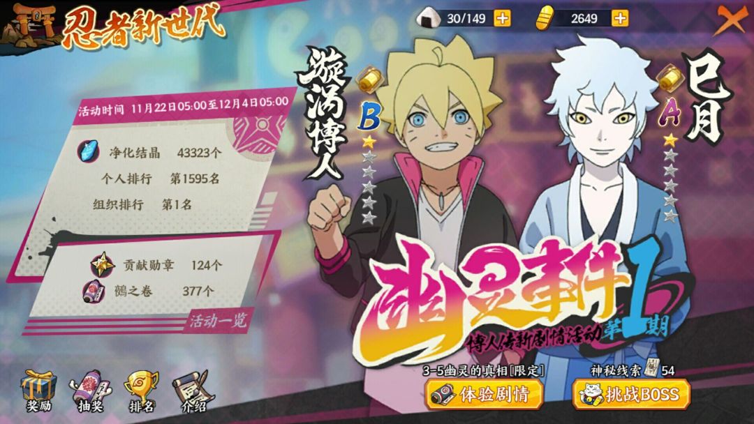 这个活动的核心玩法就是打BOSS,小伙伴们可以在博人传活动中点击“挑战BOSS”进入,也可以从丰饶之间中进入。挑战BOSS中有三个类型,分别是“木叶的幽灵”、“忍校老师的实力”、班长的真实身份。