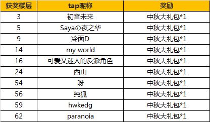 啦啦啦,本兔子来了,这次活动一共有10名幸运的巫女大人获得中秋节大礼包,以下为具体的名单哦,还请加入官方群联系管理员(兔子)登记相关信息领取奖励~(需提供tap个人信息截图、姓名、联系方式、邮寄地址等信息)