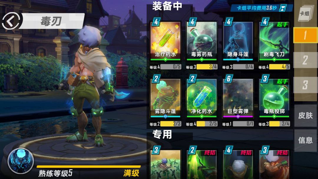 具体的意识技巧:没必要短兵相接,既然是瓶子毒,自然就不依靠普攻。开场尽量拉开距离,没有毒牌的毒刃是没资格摸对方的。尽量等手中有两张毒使用(尽量不要单纯的把【巨型雾弹】用于叠毒),续毒请尽量在毒走完四分之三时续下一张毒(以前没修改CD的时候二分之一的时候就可以续毒了)。