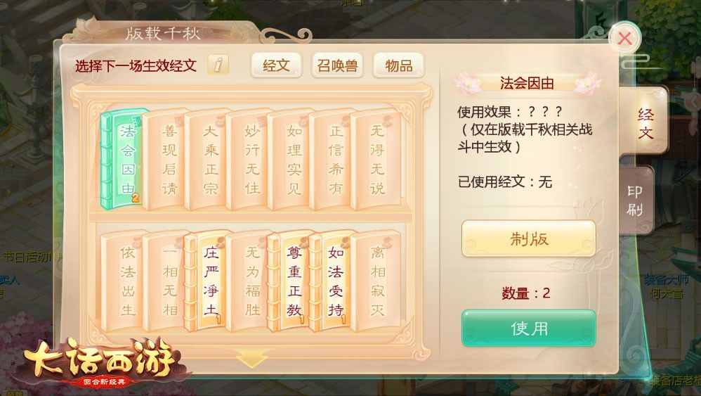 活动正式开启之后,玩家可以组成3人或以上的队伍,前往长安城中的任务NPC处领取活动任务,并根据指引寻找相应的罗汉,进行组队战斗。在战斗中玩家可以通过经文界面选择携带对应经文,不同经文的使用效果各不相同,还可能影响下一场战斗的奖励哦!