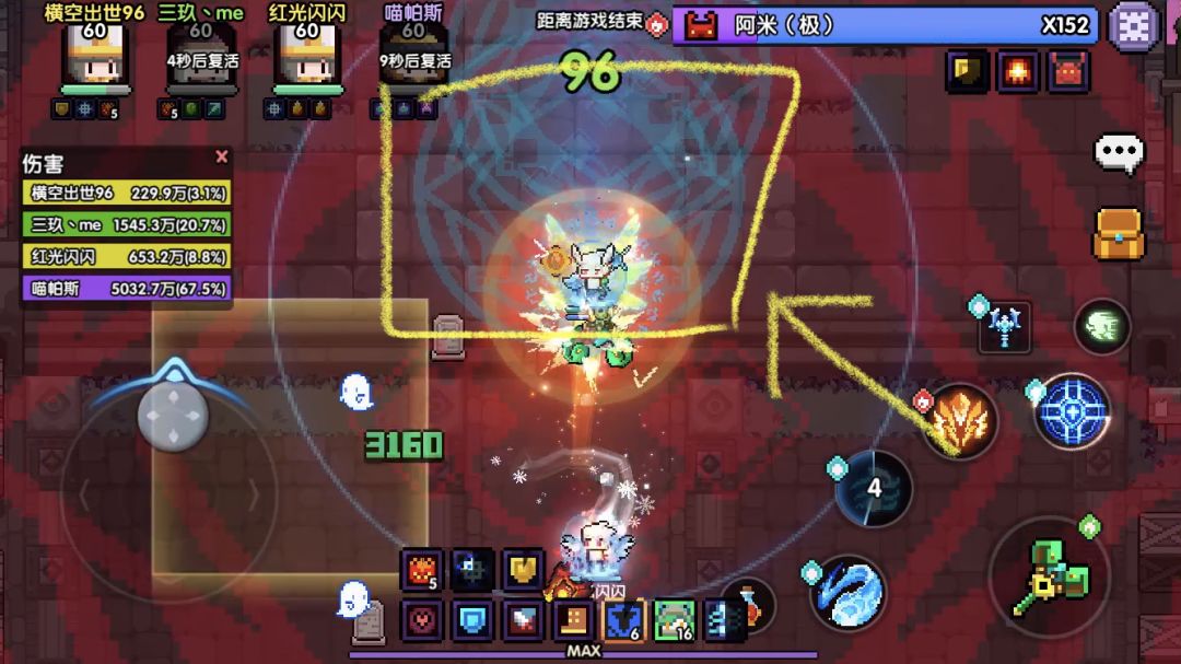 本阶段注2:第四个技能在释放的同时,地图会刷出两个蓝色的小圈(图3)。站在蓝色小圈内即可无敌规避掉本次伤害。两个蓝色小圈位置有时刷在一起,有时相反方向各刷一个。需集中精力观察(对色弱不友好啊woc,我都是跟着队友跑)