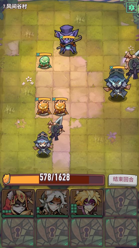 分别使用迦尔纳和李轩辕打死后面两只红色史莱姆,然后利用名字最长的那只猫打死后排两只小怪