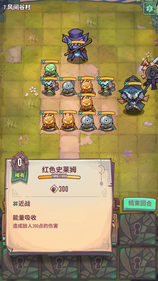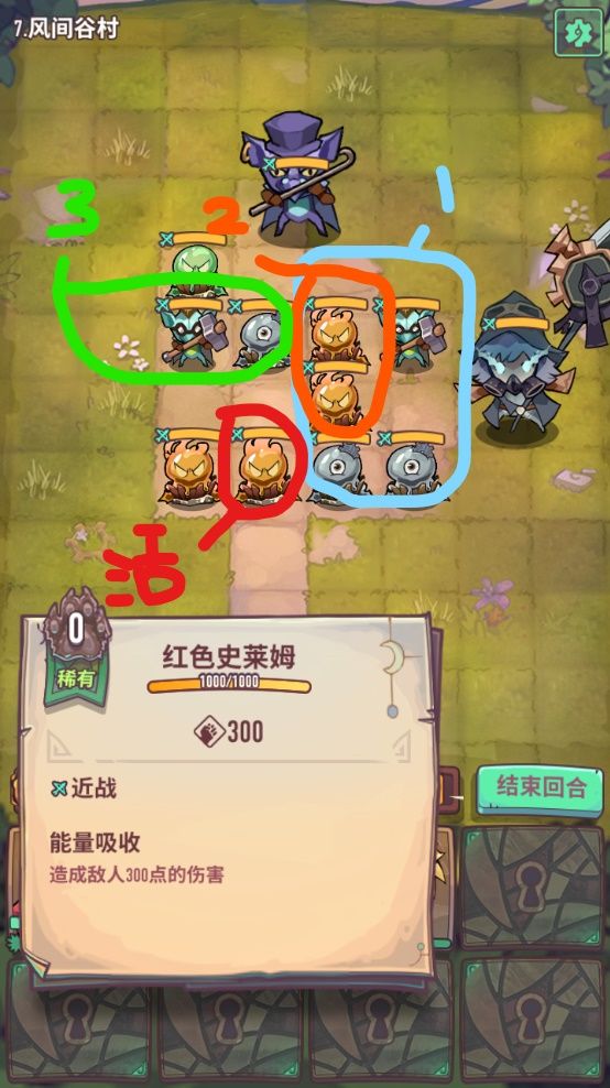 为什么要留下前面两只史莱姆呢?因为这样可以有怪挡住那只伤害2000的猪!不要浪费迦尔纳的伤害去阻挡它