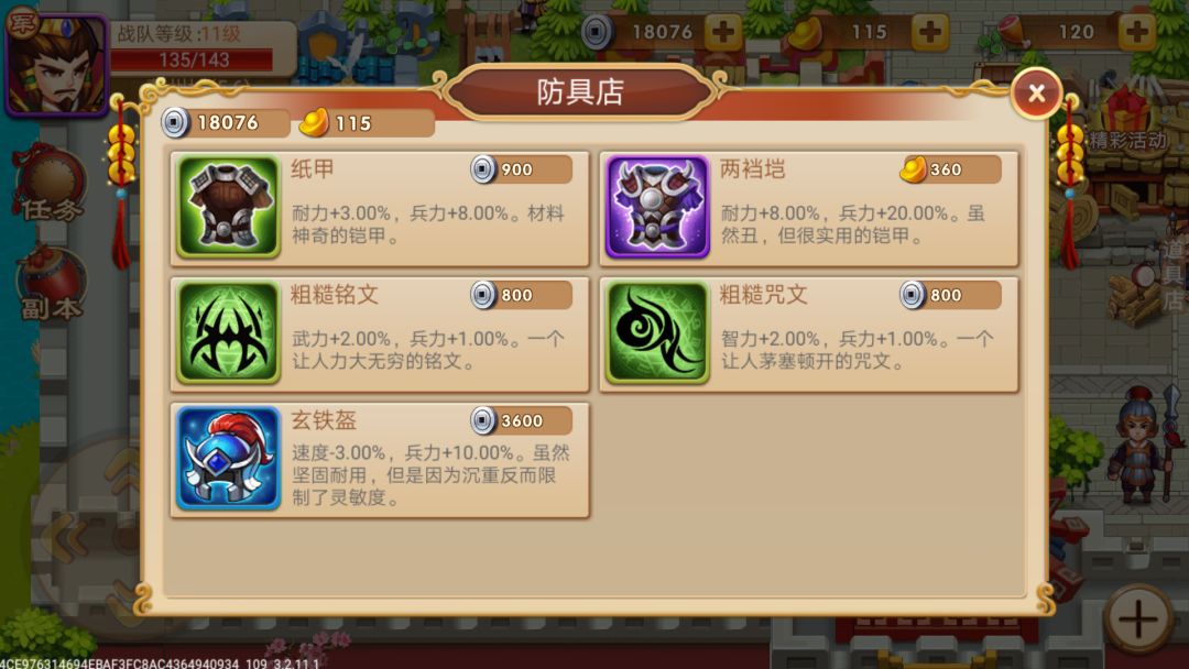 3.新野(6,13)防具商人卖360元宝紫色甲(掩心铠兵力+20%耐力+7%智力+3% 山纹铠耐力+8%兵力+20%策略+5%)。