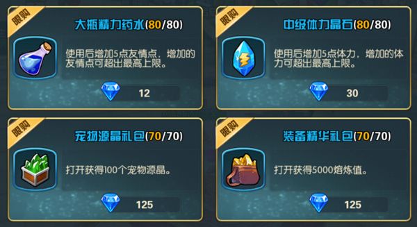 1级宝石袋:20水晶限购10个,获得随机1级宝石一个,同样是前期提升实力必备道具。