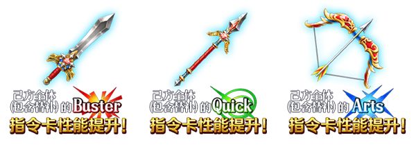 使用「勇者之剑」「勇者之枪」「勇者之弓」可分别使己方全体(包含替补)的「Buster」「Quick」「Arts」指令卡性能提升。
