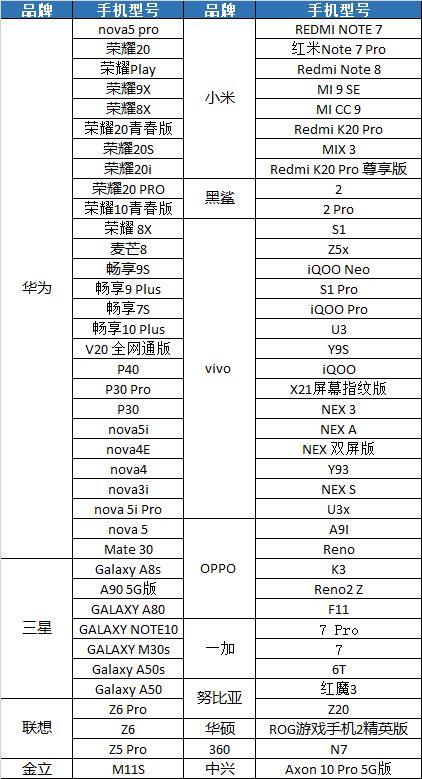 2.手机型号:下列为通过技术测试筛选的推荐机型列表,以下机型也符合测试要求。