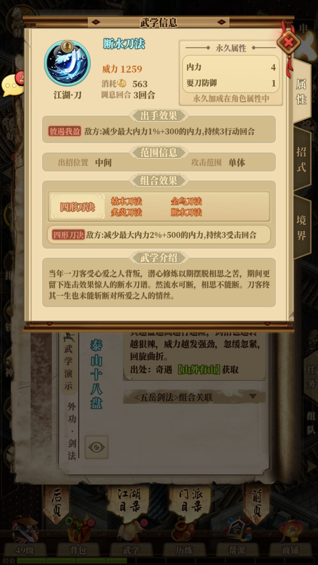 评价:前期很不错的刀法组合,四式武学也不会很拥挤,搭配门武或者后期的刀法组合应该不错的效果.