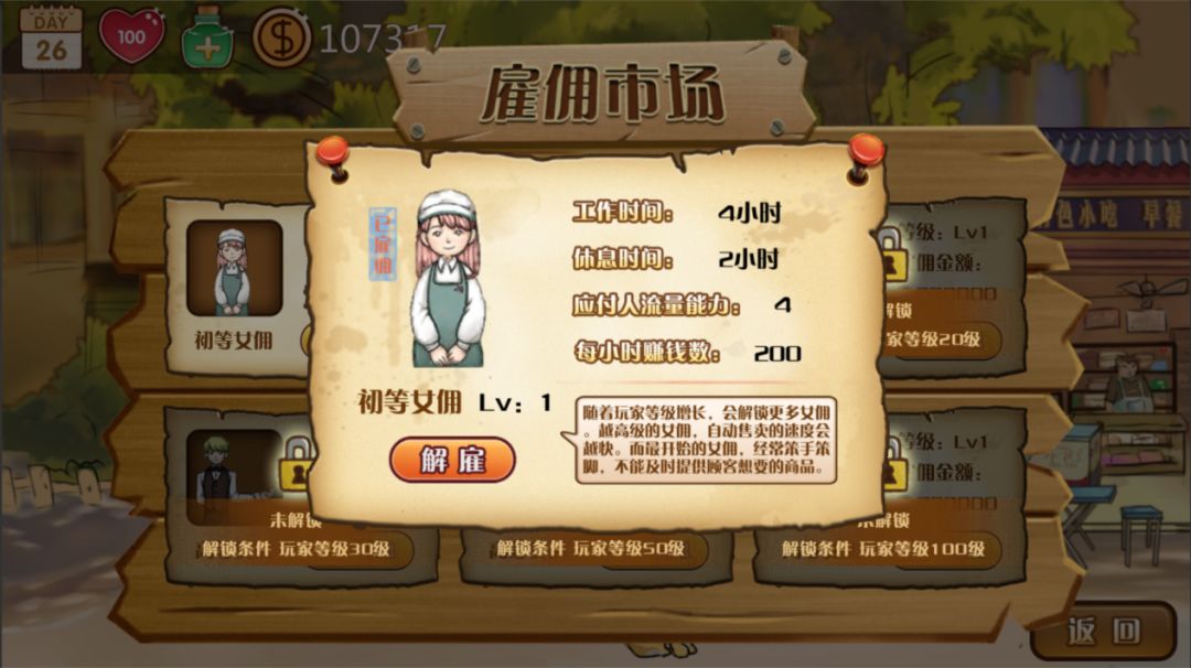 游戏中想要赚钱就要需要不停地服务顾客、看管好店铺……可以说是非常的辛苦了,对此游戏中推出了可以减轻玩家辛苦,让人轻松赚钱的功能——雇用市场。你可以花费少量的金钱在雇用市场上雇佣到劳力为你工作,每小时都可以为你带来不菲的收益,作为店铺的主人,玩家就可以坐在家里等收钱啦。