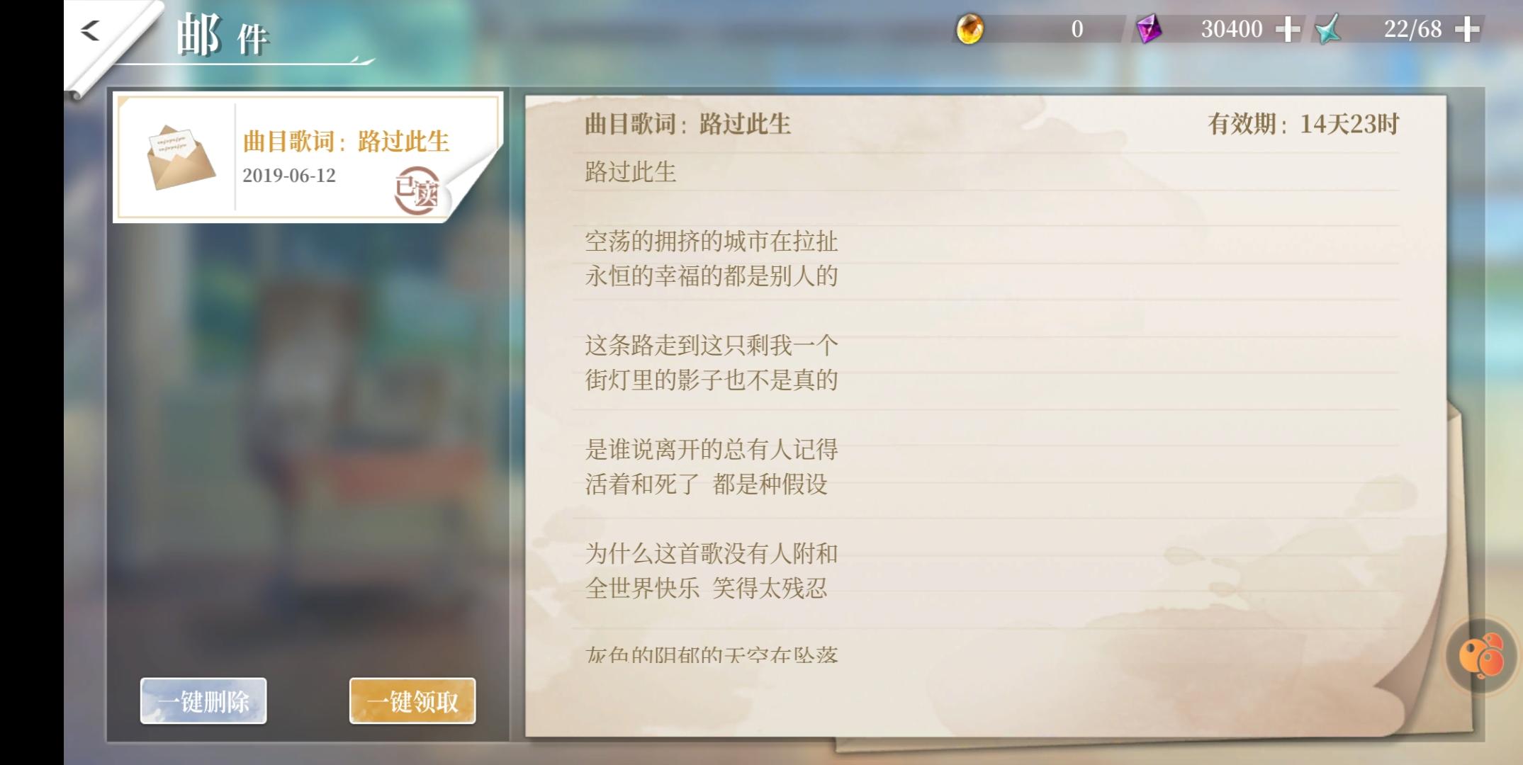 这首歌很好听的哦,在打完追影——永夜篇章会将这首歌发到邮箱中,喜欢的小伙伴可以继续看哦