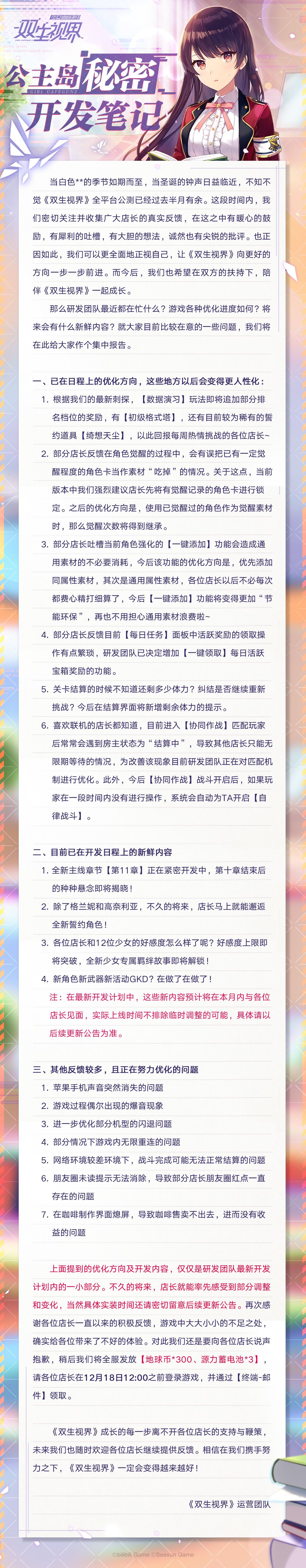 《双生视界》公测以来,我们收到了大量来自店长的反馈,为回应店长的热情与期待,小七将在《公主岛秘密开发笔记》中将近期游戏的最新情报告知大家,望店长认真阅读~鞠躬!