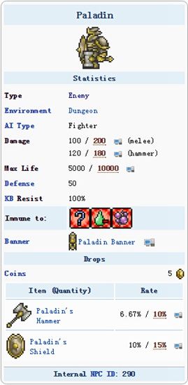 打死后可掉落圣骑士之锤和圣骑士之盾,当你觉得自己的防御很高,你可以用圣骑士之盾来换生命十字盾,建议还是不要换,除非打单个的大BOSS,但天上本人觉得盾牌的观赏和收藏价值远大于使用价值。关于圣骑士之锤我就不必多说了,是战士的毕业武器之一,攻速很快,但是唯一的缺点是不能穿墙。好啦,上次说的打完石巨人之后,地牢门口会刷新远古教徒,打死四个小教徒后会刷出一个大教徒,上图