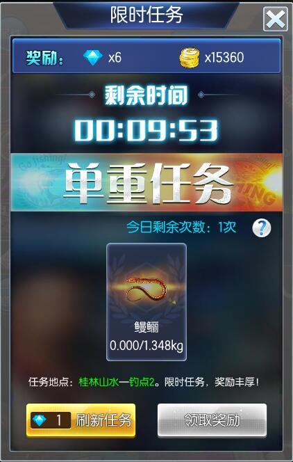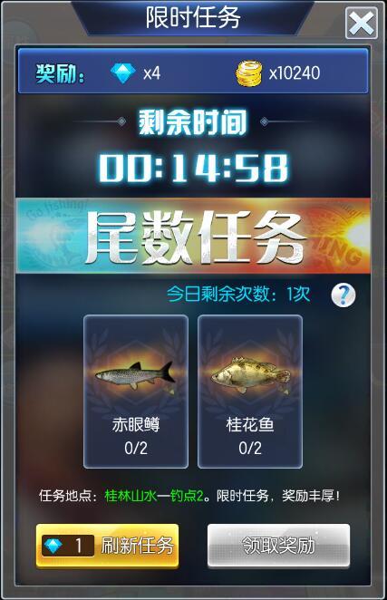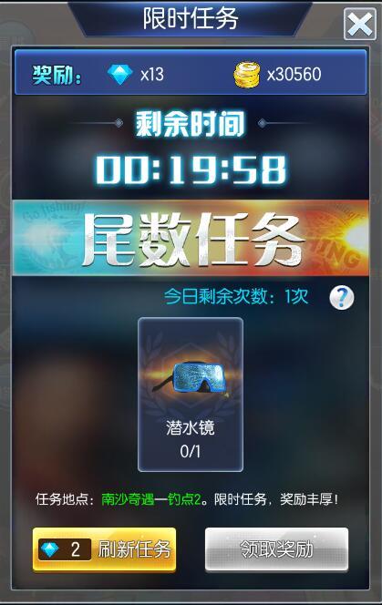 限时任务每天一共可以免费领取3次,每个钓点只限领取一次,在领取任务后正式开始倒计时。任务执行过程中可以根据需求对任务进行刷新,刷新需要支付一定的钻石,钻石根据任务难度进行相应的变动,而刷新后的任务种类、任务需求、任务时间等都会重置。
