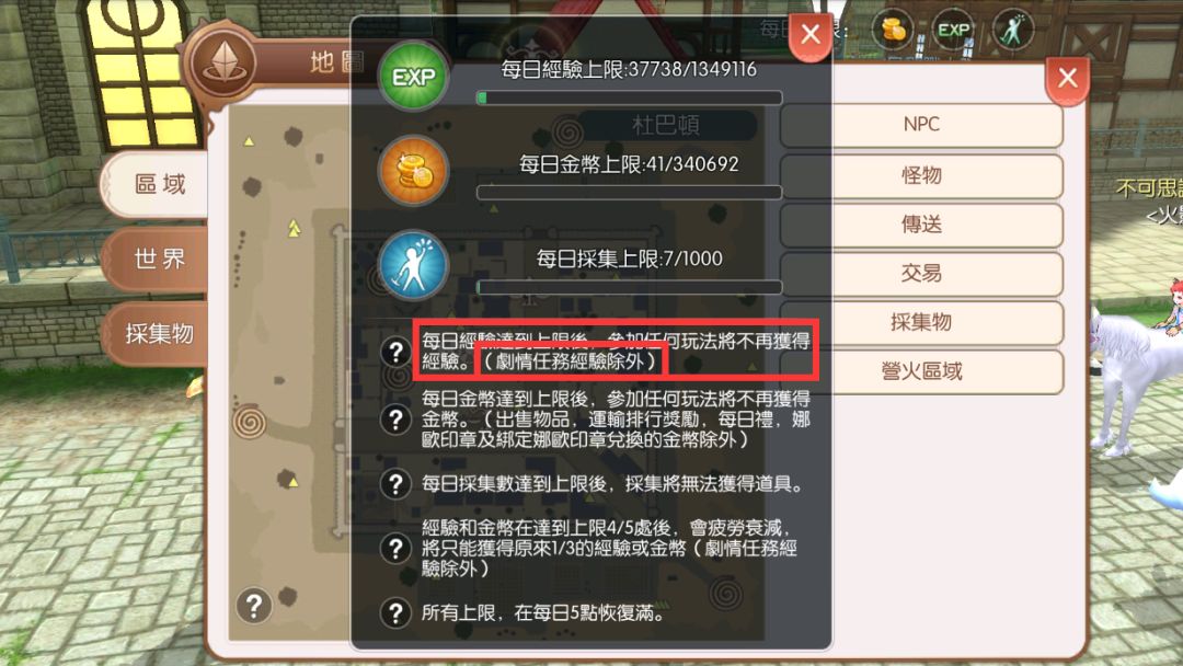 这里解释下红框的意思,剧情任务不包含在经验上限之内,不管你什么时候做都可以,剧情任务经验上不算在经验上限里的。就是说就算做了主线拿了经验,也不会加进经验上限里头,所以没不要刷满上限再刷主线。(已更正)