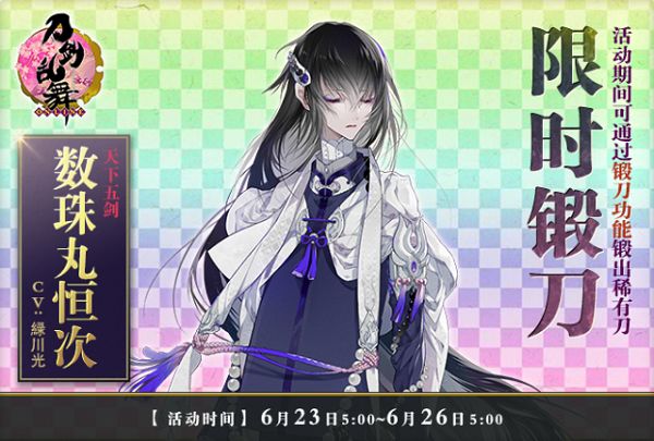 活动期间可通过【锻刀功能】有机会锻出稀有刀剑男士——数珠丸恒次。同时【数珠丸恒次搜索】战力扩充计划正在紧张进行,审神者们也可通过战力扩充计划有机会获得这位刀剑男士。