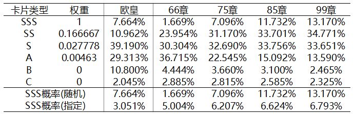 以85章为例,85章宝蛋SSS、SS、S、A卡出率分别为11.732%,33.701%,33.756%,15.092%,由于直接获得的卡片无法指定而合成可以指定,将SSS概率分为随机概率(11.732%)和指定概率(33.701%/6+33.756%/36+15.092%/216=6.624%,如不理解请看讨论前提1)。