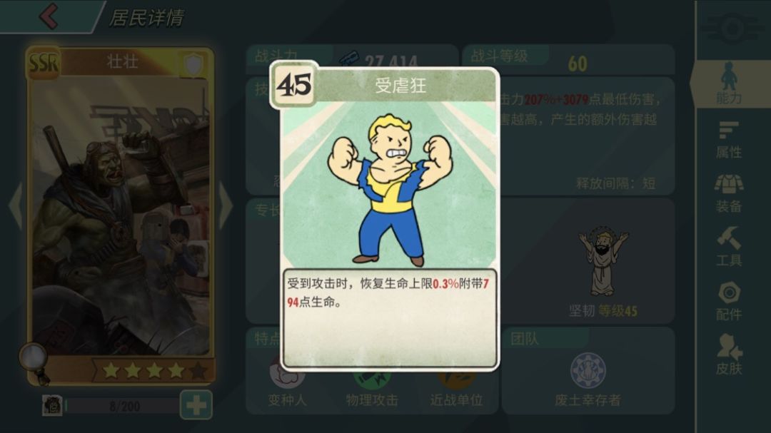 受虐狂,壮壮的特色专长,被攻击恢复固定血量加上0.3%最大生命值,这个专长可以让壮壮每次被攻击都能恢复大概一千多血量,多段伤害对于壮壮来讲很友好,刷图的机器人突突突反而给壮壮加血。pvp也是一个神技,给张图你们感受一下