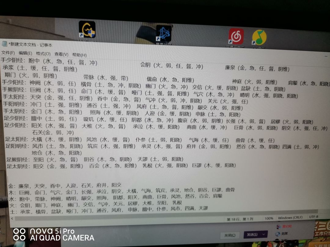 手少阴经:胞中(水,急,任,督,冲) 会阴(火,弱,任,督,冲) 廉泉(金,急,任,督,阴维) 承浆(土,缓,任,督,阴维) 期门(火,弱,阴维) 带脉(水,强,带) 儒俞(水,急,阳维) 神庭(火,弱,阳维) 肩颙(水,急,阳跷)