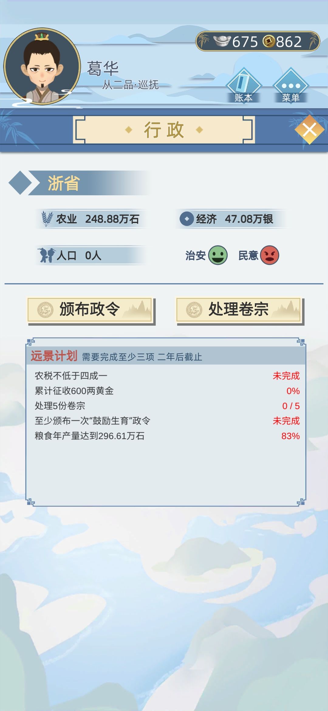 上一辈做到四品巡抚,实在受不了就把税收都调到8成,来年人口直接为0,过了几年都没变,然后突然暴毙了。这辈子没中状元,当了翰林然后直接又派我回来做这省巡抚。人口为0要怎么搞啊,没人连案件卷宗都没有