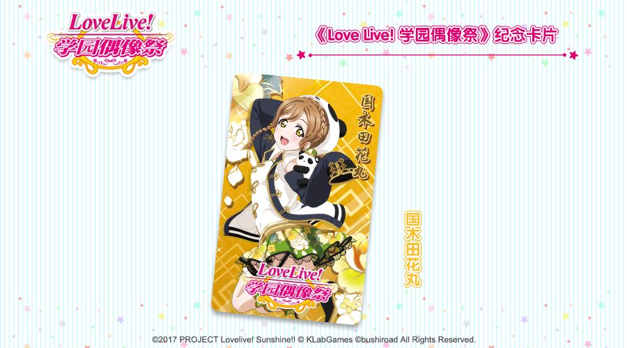 *本次《Love Live! 学园偶像祭》简体字版纪念卡片分九种,每种卡面将仅限于2019年中的一场线下活动发放。(例:将于本次chinajoy 线下活动中发放的 “国木田花丸”卡面的纪念卡片,不会在其他的线下活动中再次发放。)