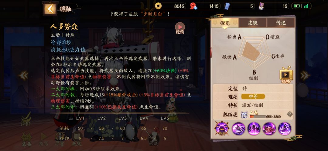 二技能【人多势众】这个选武器机制很迷(而且都是百分比伤害,为了更好贴切胖揍的特质),每次开始都是随机的,实验过绝大多数情况并不会依照你上一次使用的武器而顺延,因为很多情况单挑会出现没法及时切到稳定控制。这里略微提一下这三个武器特点。棒子,一般多用于抓人的控制,眩晕时长随技能等级提升。戟,多用于打野或者是对于血线的压制。斧头,用于脱战回血,只要有蓝镰鼬就可以通过三技能续航不需要回泉水。