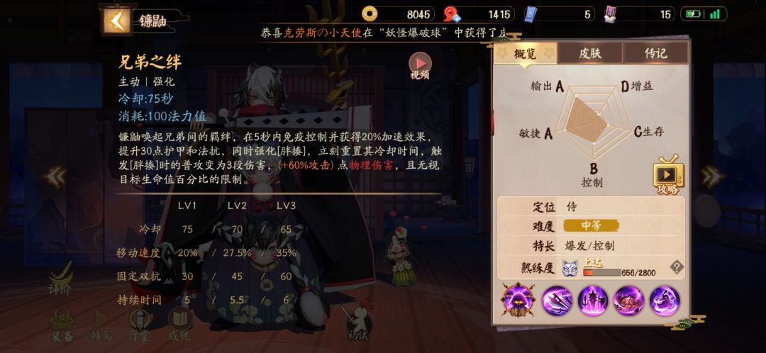 四技能【兄弟之绊】镰鼬作为之前幻神的资本,5秒的免控和加速还有胖揍变为3段伤害(60%*3)以及可以无视血线要求直接触发胖揍,基本可以切死任何射手(最大减伤的小公主,复活圈中的射手,判官有被动的话,此话作废)。