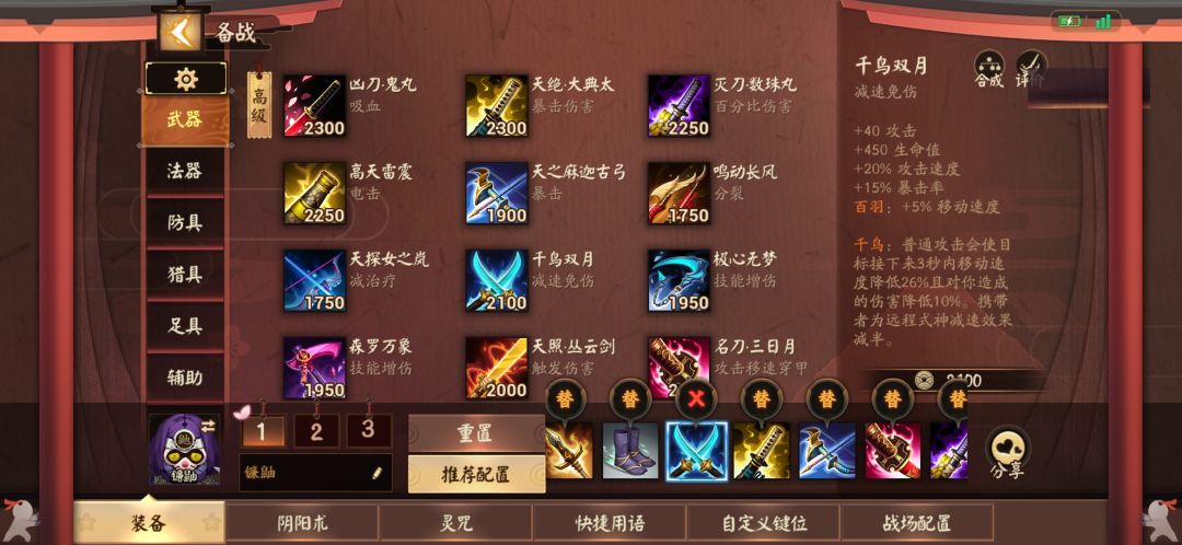 【无字枪】这里不选择攻速刀的原因是因为需要额外的攻击加成,平a流打野基本必出不多说。【护甲鞋】由于镰鼬大招自带免控因此出件护甲鞋在与射手对a的情况下能够占据一定优势。【千鸟双月】镰鼬作为平a流打野短板就是没有位移,只能靠二技能的控制aaa,千鸟的减速能够在一定程度上弥补追不上人的不足。【大典太】镰鼬的核心装备,必出。特质胖揍属于普攻可以触发暴击效果,也是镰鼬爆发的来源。【天之麻】根据攻击次数提供暴击率,直到触发暴击为止,你说啥?90暴击率的首无抽不出暴击?镰鼬笑而不语:我胖揍多段伤害还怕脸黑?(笑)。【名刀三日月】所谓的黑切,镰鼬不同于其他打野,是靠平a吃饭的,之所以选择三日月,看重的则是移速加成和坦度的支撑。【数珠丸】由于胖揍是多段普攻伤害因此每一次胖揍都会额外触发数珠丸的被动。一般可以用来替代无字枪而不是护甲鞋(个人观点,镰鼬可以通过三技能在他人视野之外偷偷摸到蛇坑背后,这里卖无字枪的好处是可以避免一些小心机的卡蛇坑背后造成惩戒失误)