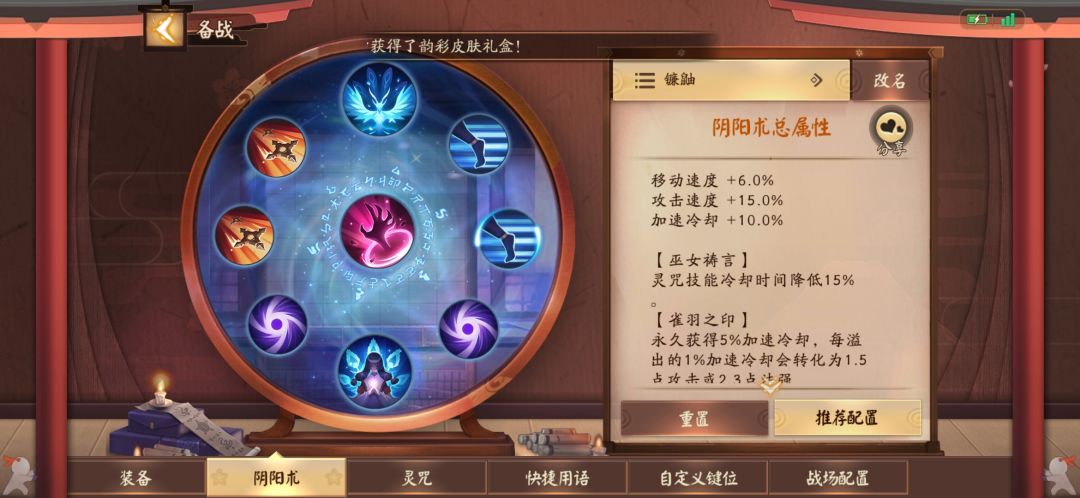召唤炼狱在二技能的控制方面可以打出一定持续伤害,攻速和移速这两个方面是镰鼬特别需要的,加速冷却是为了能够前期弥补三技能冷却过长的短板,选择雀羽也是这个思路。巫女配合二技能惩戒能够弥补续航,一定程度加快了闪现的冷却。(具体属性:移动速度6% 攻击速度15% 加速冷却10%)