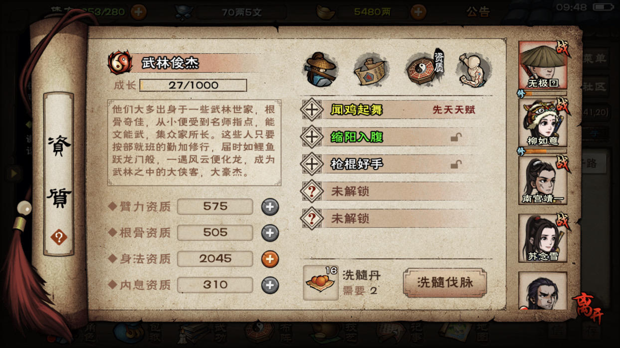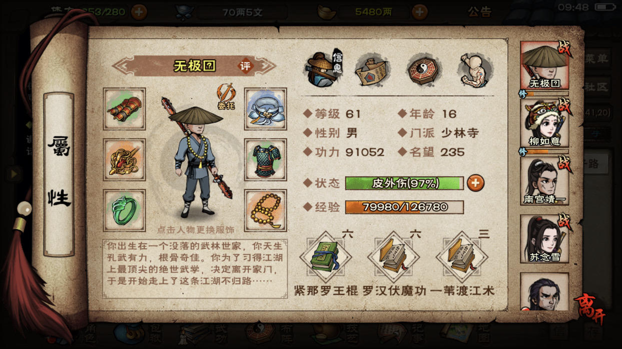 四个初始阵容,苏姐姐用毒剑加点墨,柳妹用减速腿(七重),南宫铁砂掌(过坎滴神)!一次性拿到归元剑意和碎虚指,另外今天还拿了血战五式,兜兜里只有五文钱了..有路过的少侠赏根糖葫芦嘛