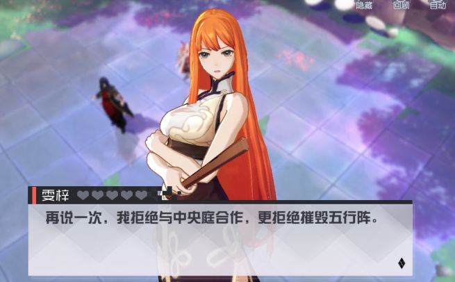 【雯梓】想发动大阵,不凑巧正好反噬发作,【钟函谷】介绍说,整个五行大阵就是靠【雯梓】一人支持,因此【雯梓】无法离开一步,玩家表示这样你的力量会枯竭的,但是【雯梓】不为所动表示这是原住民的坚持。突然外面传来一阵掌声,冒出来一个吴克!(拖走)不过这个画风真的很……,他来打个招呼就跑了,【钟函谷】追了上去,【雯梓】也让玩家追上去帮忙,表示自己在大阵里面没人可以伤到她(好一个flag)。