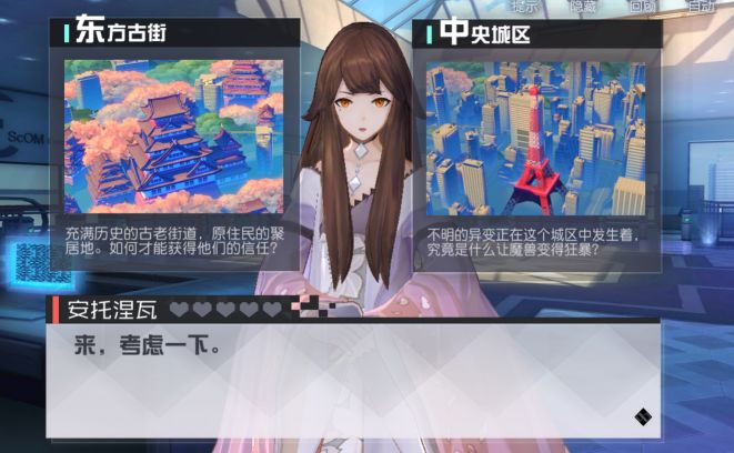 【安托涅瓦】让玩家决定去【东方古街】还是【中央城区】,这个选择也无关紧要,不会影响安线的攻略,区别在于拿到的角色不一样,请选择与上周目不同的选择,我们这里就选【东方古街】了。
