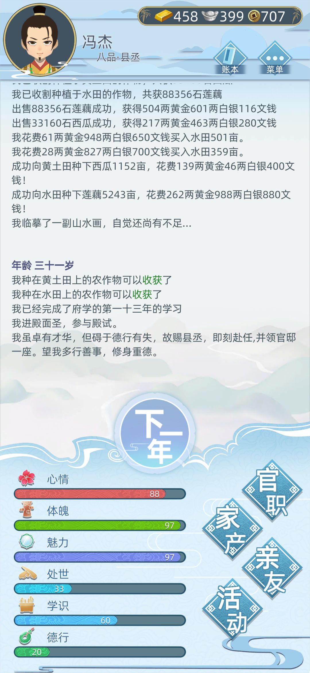 1.当官是需要德行的,因为我没有刷这个一直在种地,于是乎