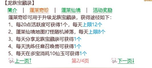 完成日常活跃任务、进入蓬莱仙境打怪、分享宝藏录、洗练召唤兽、或在多宝阁消耗仙玉,均可获得蓬莱奇珍。
