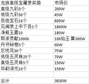 根据计算,当宝藏录升至满级之后,在“高级龙族宝藏录”中的必得奖励价值在3830W左右(不包括抽奖),总价值已经远远超过了500仙玉本身,相当物超所值!