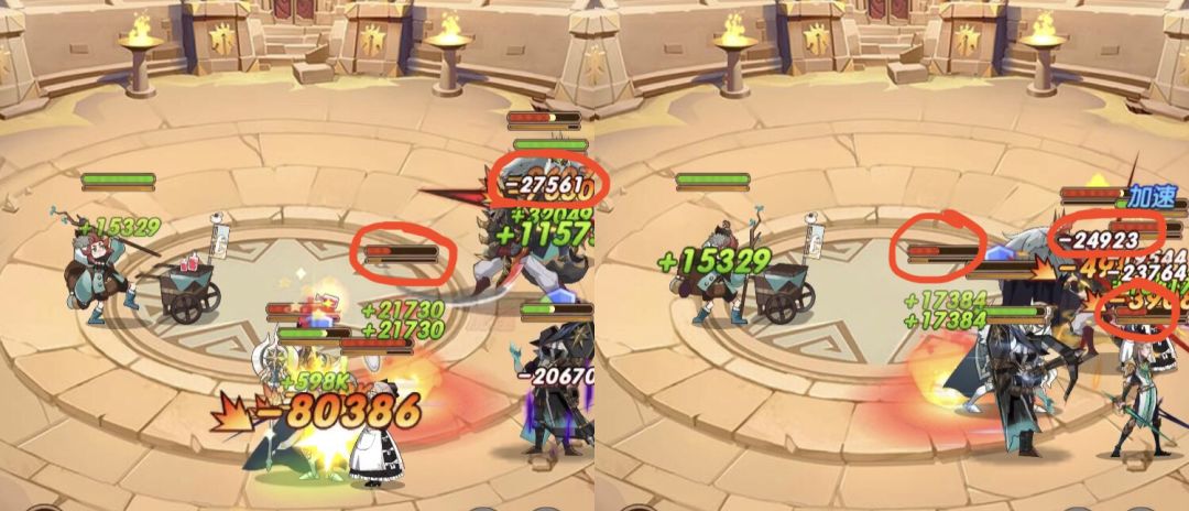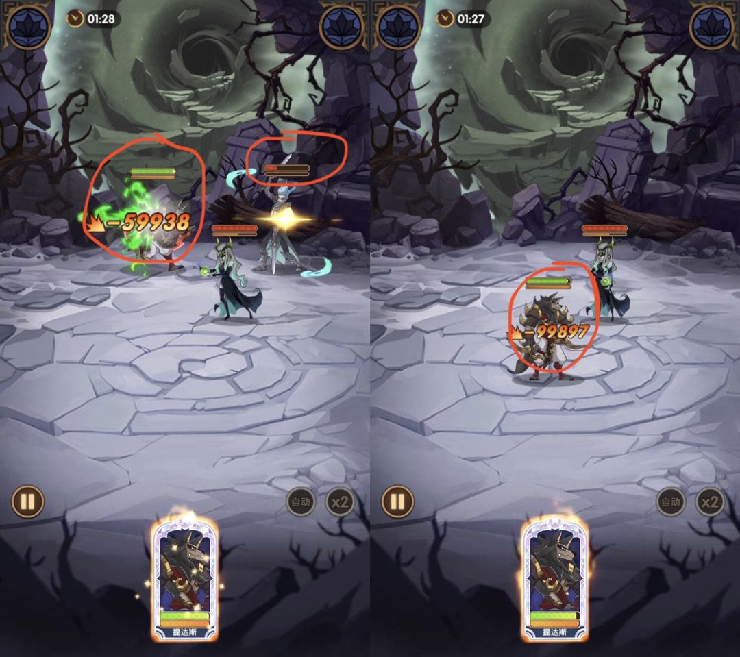 右边是开场没有无情追猎,女妖的平a造成了99897的伤害