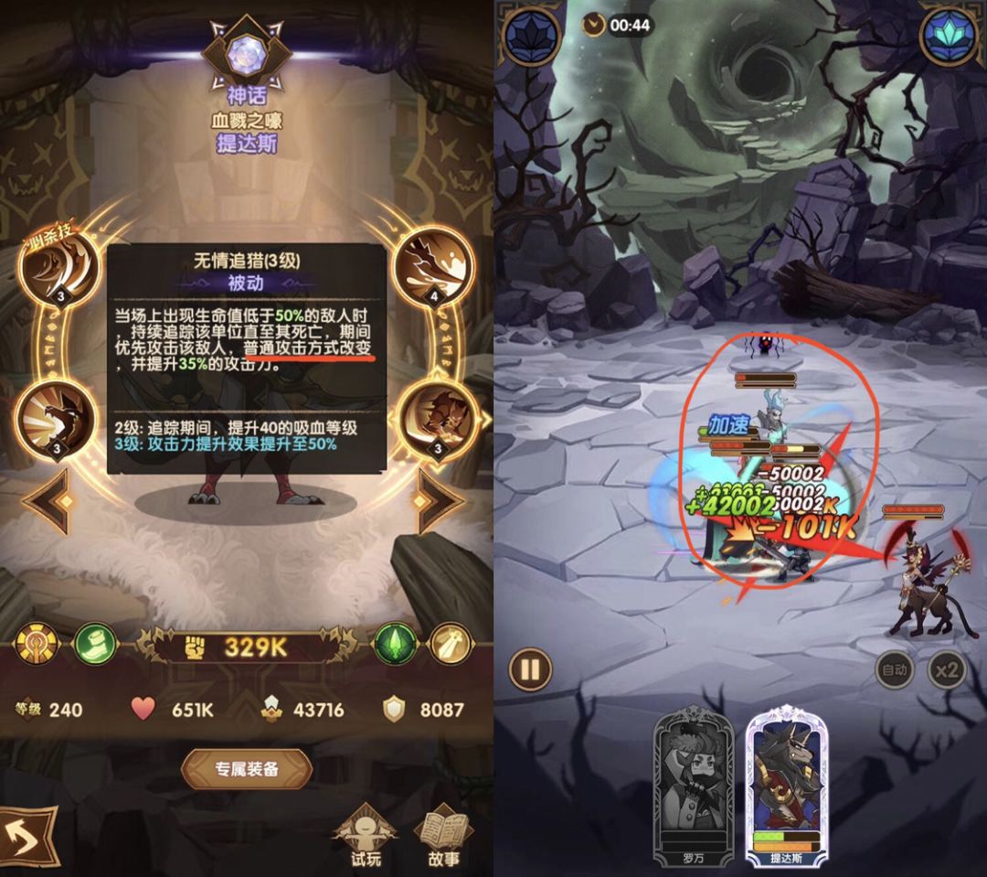 而右侧没有触发过无情追猎的狼人,女妖的吸同样造成了46925的伤害(由于女妖的攻击力是根据血量浮动的,伤害数字有略微差别,但是也能明显看出来是没有触发专武的40减伤的)