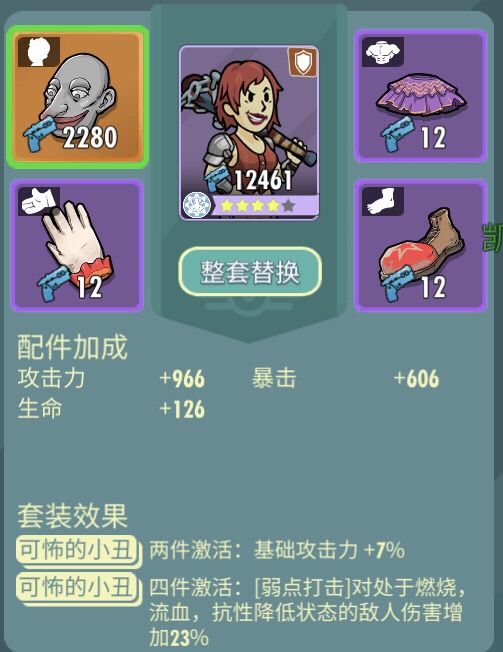 可怖的小丑 主属性 头部:攻击力 暴击值 手部:攻击力 暴击值 胸部:攻击力 生命值 脚部:攻击力 生命值 套装属性