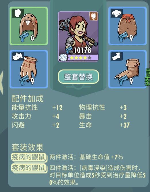 疫病的鼹鼠 主属性 头部:能量抗性 生命值 手部:物理抗性 能量抗性 胸部:攻击力 暴击值 脚部:生命值 闪避值 套装属性
