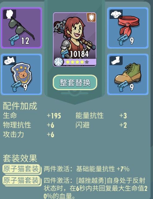 原子猫套装 主属性 头部:生命值 能量抗性 手部:生命值 攻击力 胸部:生命值 物理抗性 脚部:生命值 闪避值 套装属性