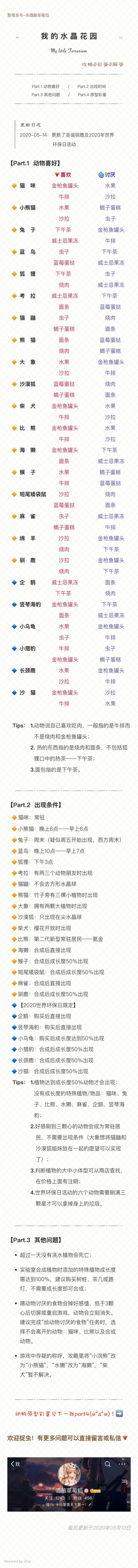 2020年5月14日更新:添加了驯鹿和世界环保日活动的六只动物相关喜恶、出现条件。这次的六只小动物好像没有故事,过几天答辩完来写写小科普好了~