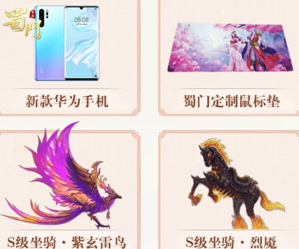 成功击败铁匠通关副本之后将会获得本次活动准备的奖品。可获得永久腰饰,改名卡等珍惜道具,更有机会获得S级坐骑紫玄雷鸟和烈魇,以及华为手机,蜀门限量周边等实物奖励。丰厚的大奖一波又一波,赶快叫上小伙伴来通关镇魔砧吧!