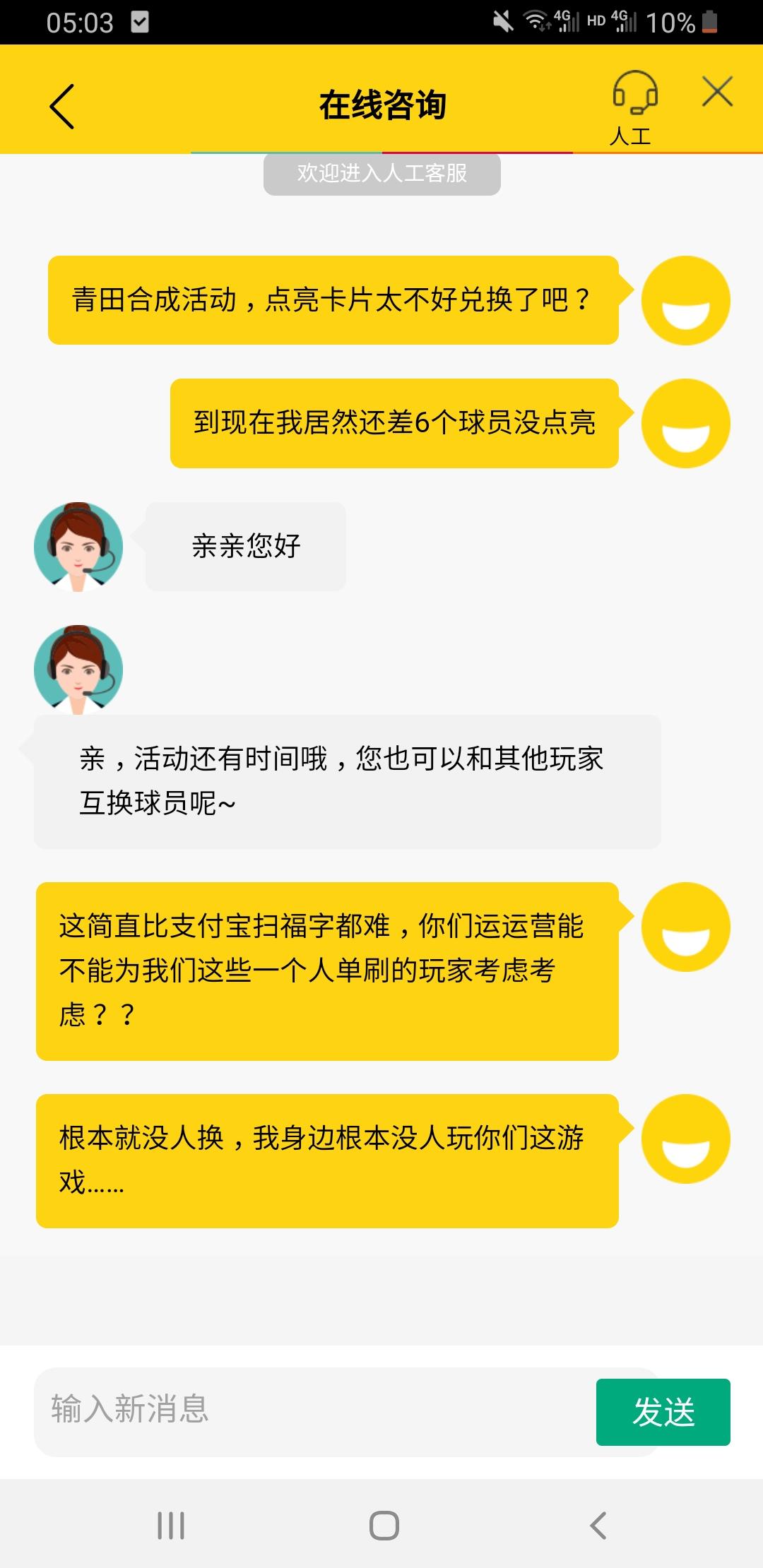 我请教过客服,客服让我找社团和好友要,俱乐部和好友活跃度都不高,而且游戏内还不能互相换卡片,你h5还做的这么不人性化,真不知道官方是怎么想的,别把情怀做成买了个bao好不好?