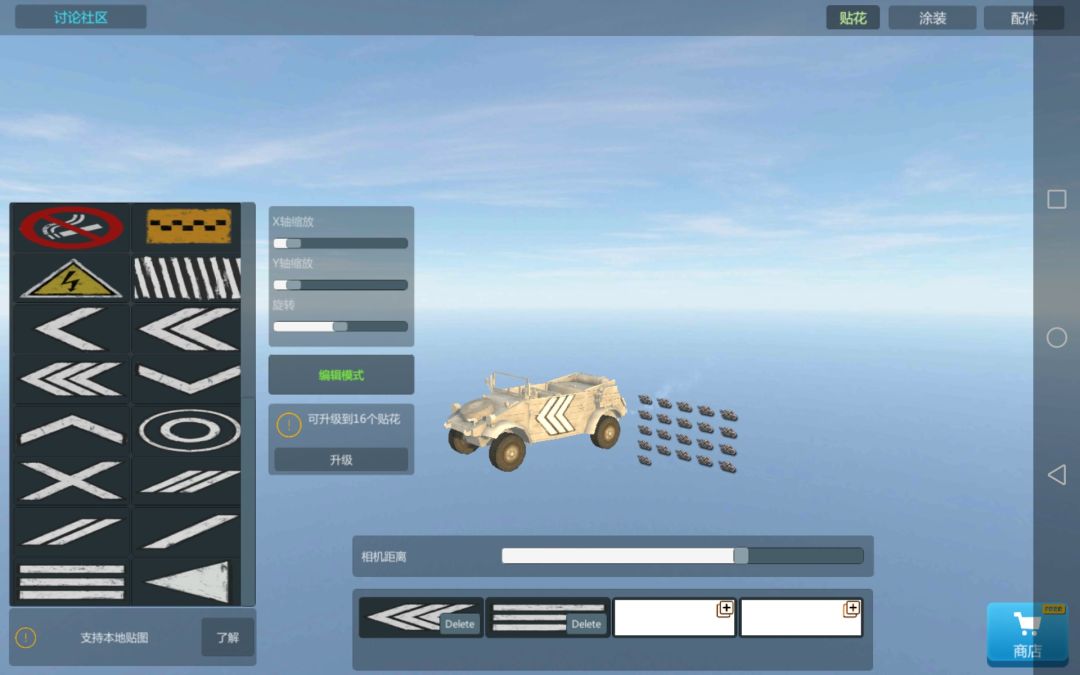 左边的一栏可以查看载具。载具左上角的数字表示不同的等级,可以用等级过滤器快速找到需要的载具。非飞行器载具可以加配件、上涂装和贴花。配件不再说;涂装分为平原、沙漠和雪地三种,各选一个,靠下的Remove Camos按钮可以重置涂装;贴花就是给坦克贴图案。