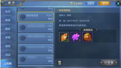 每周一都会根据排名发放奖励,名次越高,奖励越好。所以,为了更高的名次、更丰厚的奖励,别忘记每天都去竞技场和别的主君切磋哦!