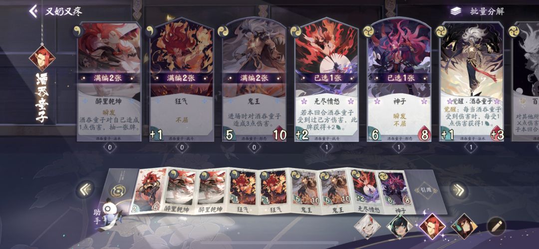 由于通常快攻卡组往往拖到后期会陷入疲软的尴尬境地,为了保证持续战斗能力,于是第三个式神选择了可快可慢、第二天签到白给的式神,茨木童子的挚友,酒吞童子。